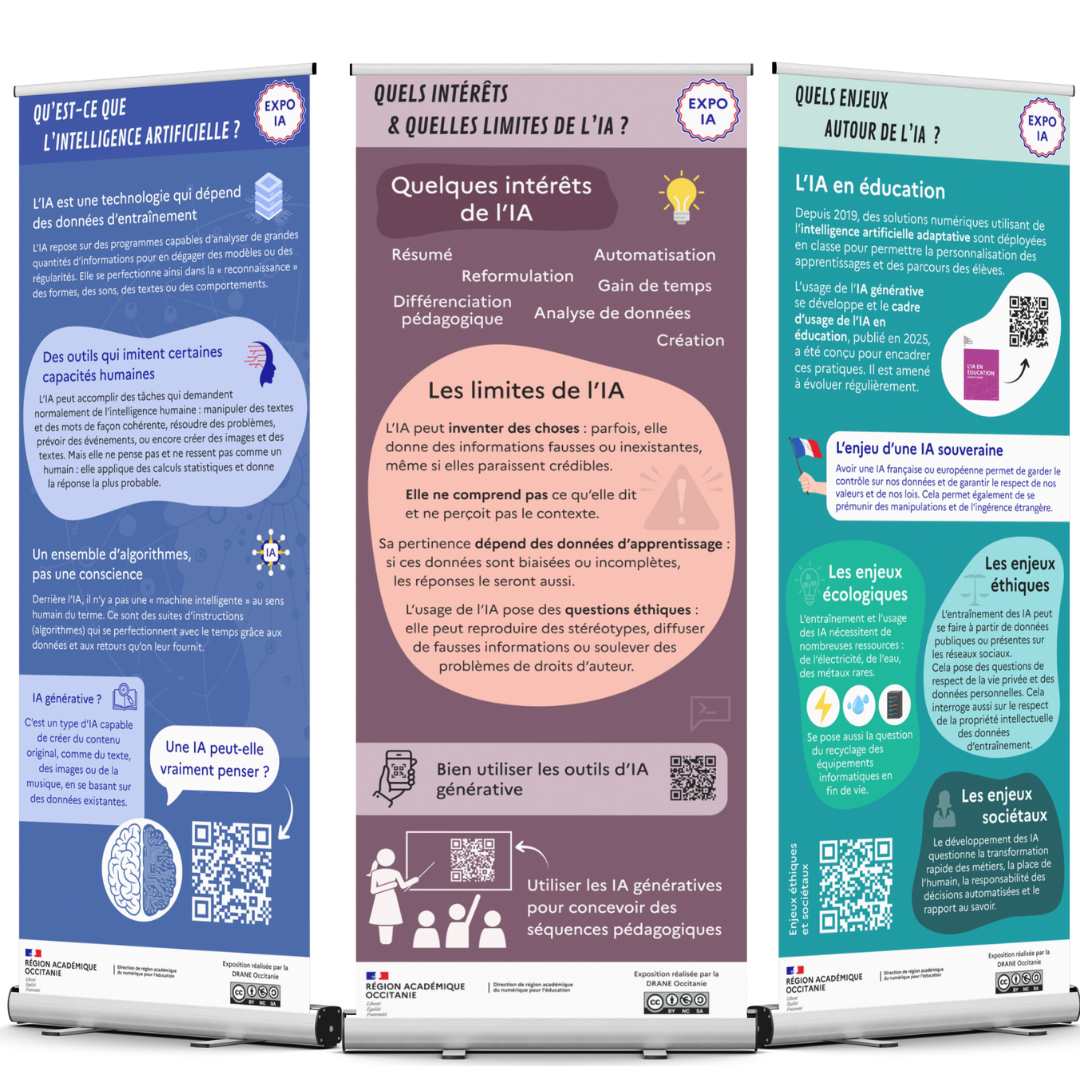 Du 04 au 20 février, 3 panneaux de la DRANE Occitanie seront disponibles au CDI sur le thème de l'Intelligence Artificielle. Leur objectif est de présenter au grand public, aux élèves et aux personnels les principes et les enjeux de l'intelligence artificielle.