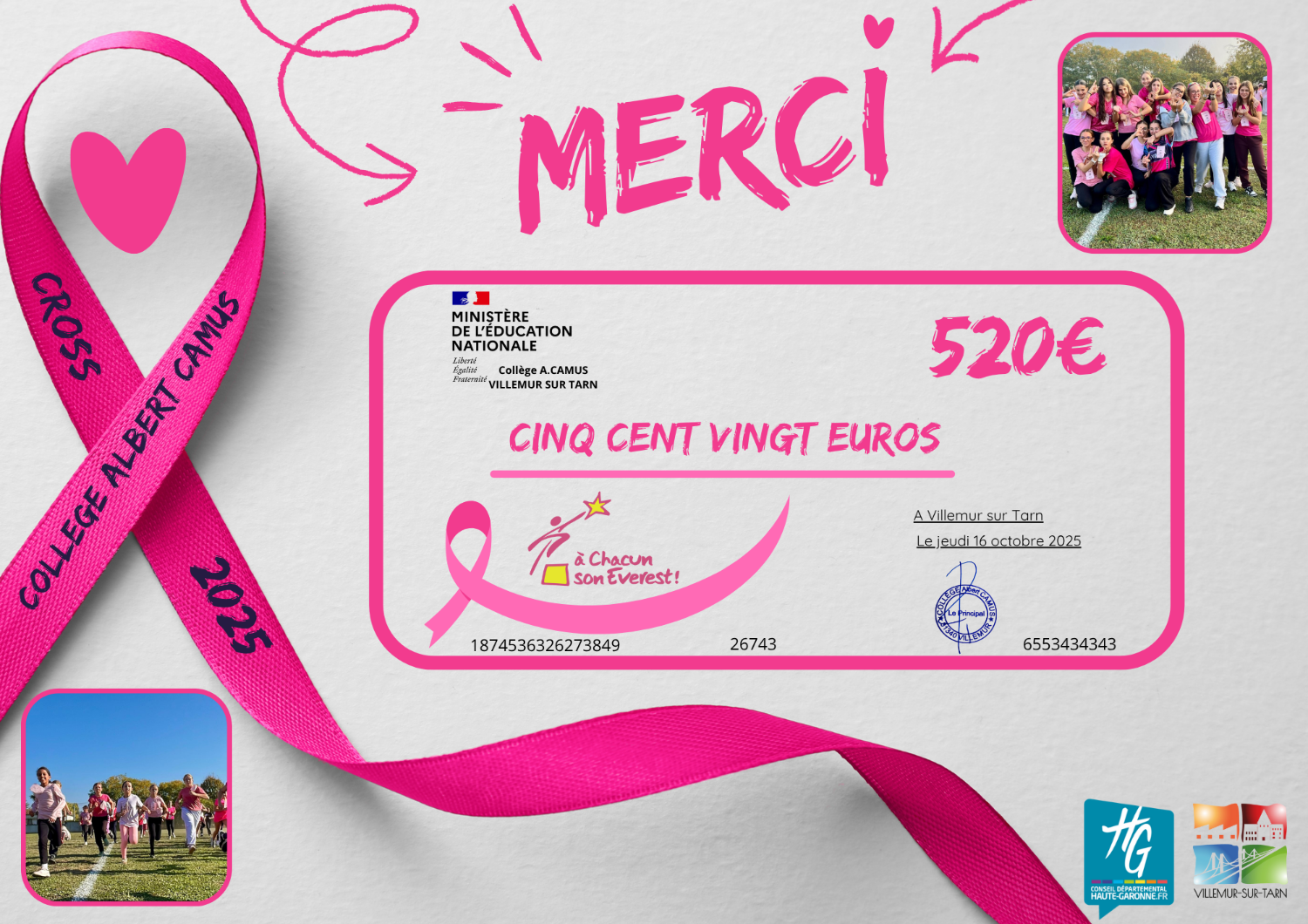Comme chaque année, les professeurs d’EPS organisent un CROSS au collège. Il se déroulera le JEUDI 16 OCTOBRE DE 8h30 à 12h30, les élèves du collège et quelques classes de CM2 des écoles du secteur y participeront. De nouveau cette année, il sera teinté de rose ! En effet, le mois d’octobre est dédié à la sensibilisation au cancer du sein. A cette occasion, tous les acteurs du collège, personnels adultes, élèves, parents d’élèves, peuvent faire un don. Une urne sera à disposition au collège afin de déposer votre don en espèce ou en chèque (à l'ordre de l'AS du collège). La somme récoltée à l’issue du cross sera reversée en intégralité à l’association “A chacun son Everest” qui accompagne des enfants atteints de cancer ou de leucémie, et des femmes en rémission d’un cancer du sein, pour les aider à affronter la phase délicate de l’après traitement et qu’ils puissent retrouver confiance et un nouvel élan de vie. Le jour du cross, pensez à porter UN TEE-SHIRT ROSE et éventuellement confectionner UN RUBAN ROSE, symbole de cette action et qui se porte en signe de soutien.